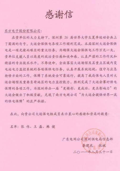 8月23日,世界大学生运动会在深圳圆满落幕,成都勇士之星企业管理咨询有限公司作为大运会唯一保电企业见证了世界大学生体育运动的蓬勃发展。成都勇士之星企业管理咨询有限公司技术中心系统部与工程部坚守“忠于职守,全力以赴,誓保大运电网安全”的信念,联手实现了大运保供电期间系统零故障、零缺陷的目标。
